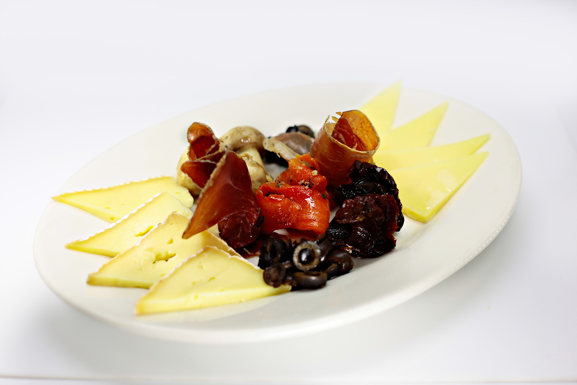 queso tentación, queso manchego, jamón serrano, tomate seco, aceitunas verdes, champiñones, pimentones asado