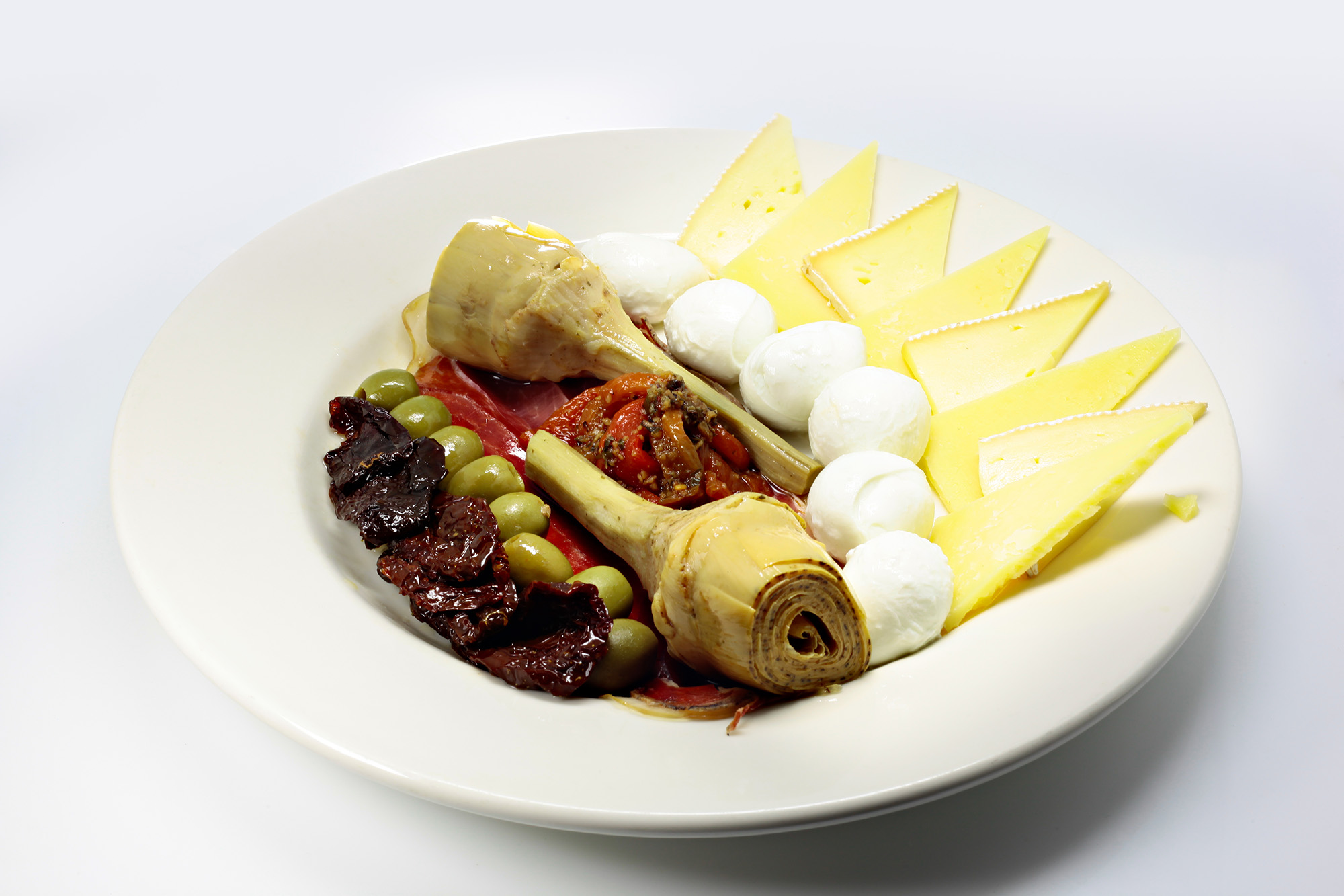 queso bocconcini, jamón serrano, tomate seco, aceitunas, queso manchego, queso tentación, pimentones asado
