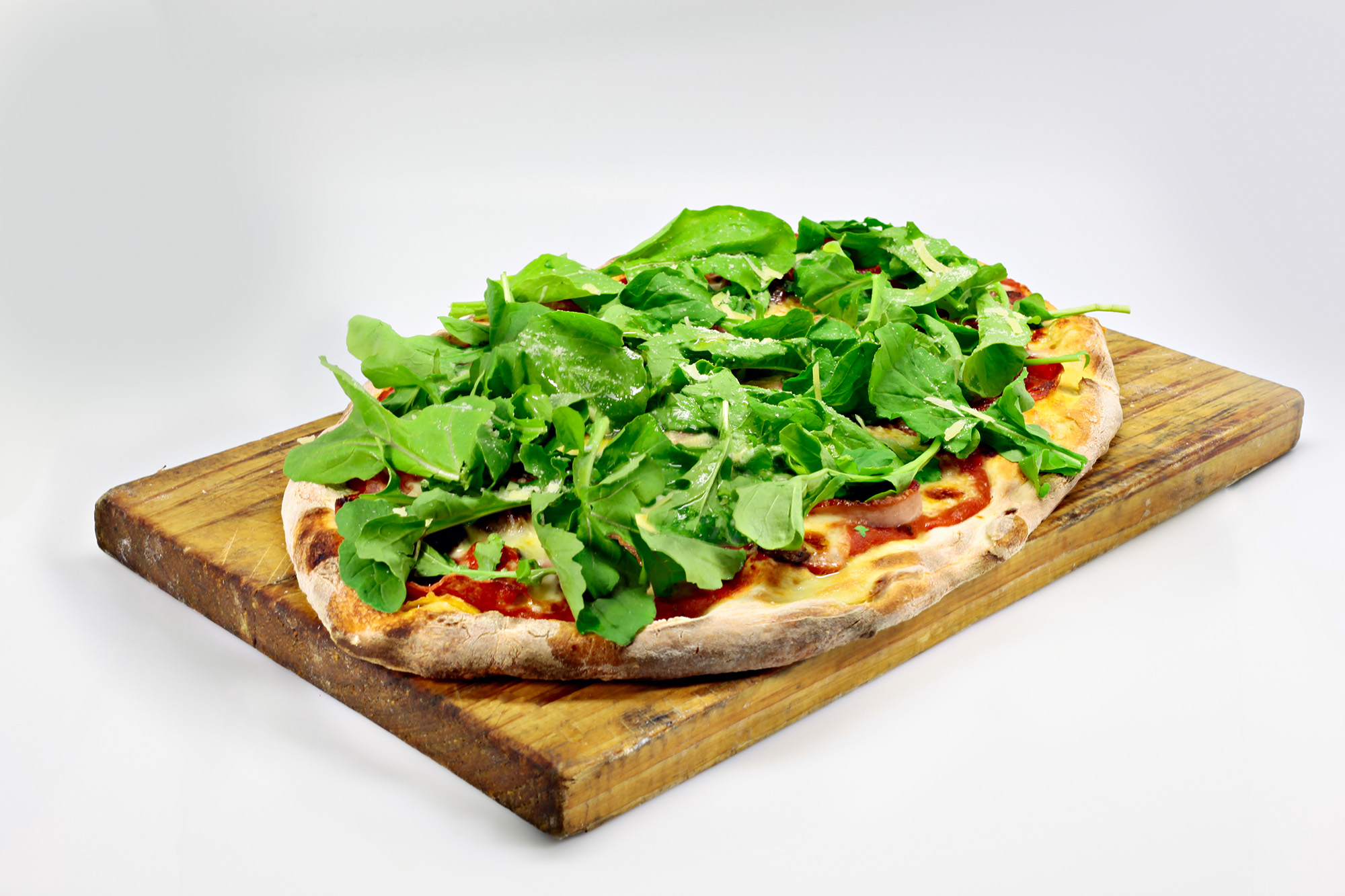 mozzarella, salsa, tocineta, pepperoni, anchoas, aceitunas negras enteras sin hueso, berenjenas horneadas, rúcula, parmigiano, aceite de oliva